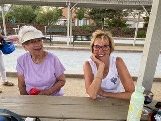 Our first Tennis Club function of 2021 was a big hit. We had twenty-three members who played tennis on a nice warm evening (some would say hot) with no wind. We played three rounds of tennis; each round every player had a new partner. Since we had such a great turnout, for each round three courts had six players and one court had four. Six players you say, how did that work out? Easy, three on a side, one on ad side, one on the deuce side and one in the middle. No just kidding. On the courts that had six players four would be on the court and two would sit out. The winning team of the four on the court would stay on the court and the team waiting on the side would come in and challenge the winners. The winners of that game would stay on the court and the team that lost first would come on and challenge the winners. The six players would play a total of six games. So as a team you would play a minimum of three games with a maximum of six games depending how many you won or lost. Somehow that seemed to get lost in translation. By the second round, that got all worked out and play went as planned. If you were on a court with four players you would play four games. We finished up at 6:30 and adjourned to the bocce court picnic area to enjoy some social time and prepare to eat a fabulous meal.